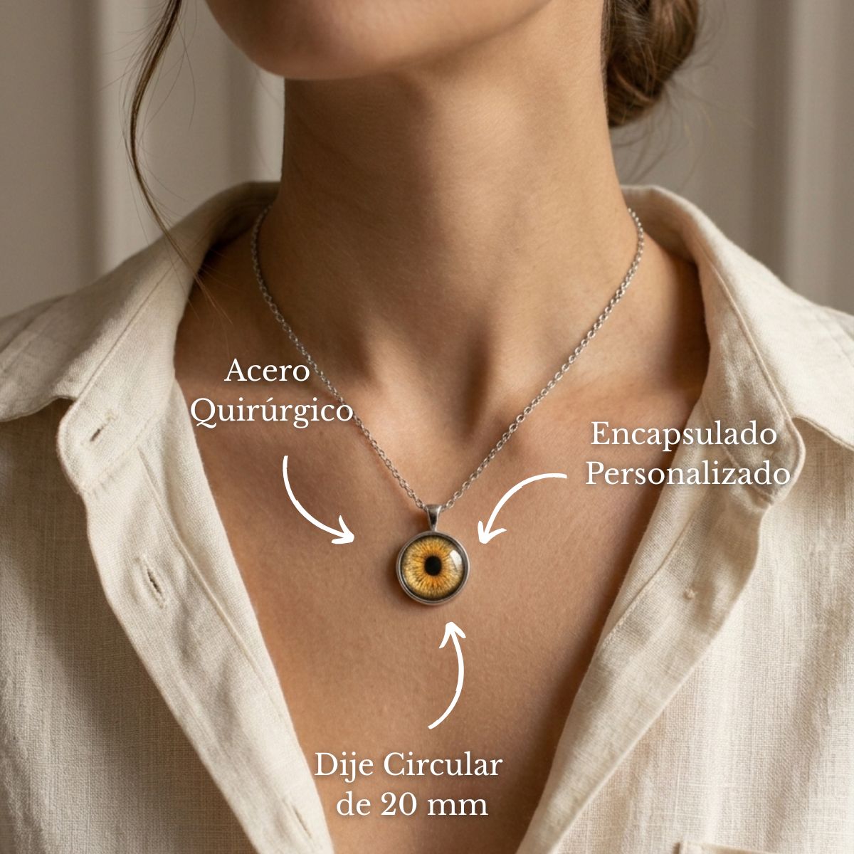 Un dije minimalista en acero quirúrgico (no se oxida ni pierde color) con 2 cm de diámetro, donde encapsulamos el iris que elijas para convertirlo en un recuerdo único: sutil, elegante y lleno de significado.